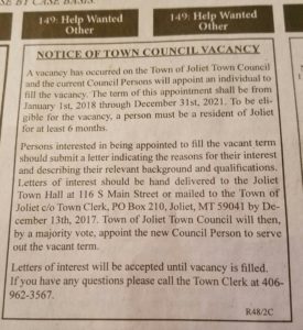 The 11.29.2017 Issue of The Carbon County News has the following advertisement in the Classifieds Section. Due to the recent November 2017 Election, The Town of Fromberg will also have a Council Seat Vacancy 1/1/2018. Why isn’t the current Administration being proactive and advertising for “our” Vacancy? They certainly spared no money in advertising for a TOF Attorney.