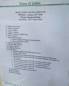 The Town of Joliet does indeed post their agenda well in advance of their Town Council Meetings. We note Agenda Item “4) Changes to Agenda” which allows for any changes that might occur after the their Agenda is officially posted. They also advertise well in advance with regard to Notices of Public Meetings, even going so far as to put them on the local bank’s electronic reader board. It is noted their Town Clerk works 4 days per week 8:00 am to 4:00pm Monday through Thursday. Closed on Friday. Joliet has a somewhat greater population than does Fromberg. We can learn from Towns with similar demographics. We need not recreate the wheel.