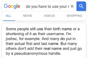 A quick Google search indicates one need NOT use a “real” name. Per the following screen shots regarding Instagram or Facebook. “Twitter” handles have been discussed in a previous post comment.