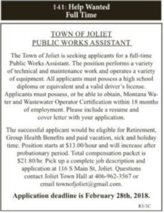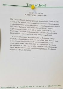 Sister Town Joliet, per photographs below, is advertising for a “Public Works Assistant”. This advertisement was published in the 2.1.2018 issue of the Carbon County News as well as being physically posted at Joliet Post Office and Joliet Town Hall. We haven’t seen evidence that the Town of Fromberg advertises for Employees in this manner. That is: Advertising in the local Paper of Record. Detailing with specificity all Employee qualifications as well as the entire benefit packet. Including Town contact information for the application process as well as a Specific Deadline. Without such evidence, we can only surmise employees are hired via an arbitrary and capricious manner. The “Good Old Boy System”?