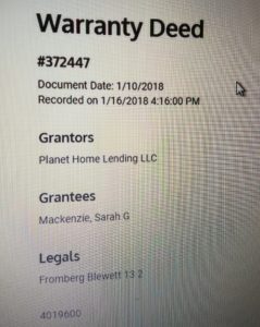 Per our previous post entitled: “TOF 2-5-2018 Council Meeting Agenda posted at mail time on 2-2-2018” we offer Item “8 Zoning Lloyd MacKenzie” a photo of which is included below. Also shown below is: Warranty Deed  #372447 dated 1.10.2018, recorded  on 1.16.2018 at 4:16 p.m. Fee Simple Title is granted in this deed from Planet Home Lending, LLC to Sarah G. Mackenzie for the real estate described as: Lot 13, Block 2 of the Blewett First Addition to Fromberg, Montana. Therefore, Sarah G. Mackenzie is the Owner of Record. Therefore any Zoning Variance Application put forth and signed by LLoyd Mackenzie would render said application null and void.
