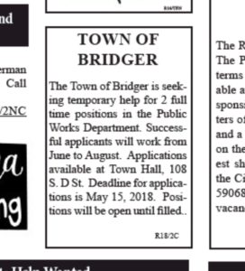 How Sister of Town Bridger Advertises for Public Works Department HelpadminMay 3, 2018Uncategorized Carbon County News May, 3, 2018 Page 9 How Town of Fromberg Advertises for Public Works Department Help…