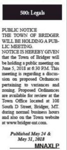The “500: Legals” section of the 5.24.2018 Issue of the Carbon County News (photo below) states: “PUBLIC NOTICE THE TOWN OF BRIDGER WILL BE HOLDING A PUBLIC MEETING. NOTICE IS HEREBY GIVEN that the Town of Bridger will be holding a public meeting on June 5, 2018 at 6:30 P.M. This meeting is regarding a discussion on proposed Ordinances pertaining to variances and zoning. Proposed Ordinances are available for review at the Town Office located at 108 South D Street, Bridger, MT during normal business hours and also on the Town website at www.bridger-mt.com. Published May 24th & May 31, 2018 MNAXLP”
