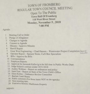 “TOWN OF FROMBERG * REGULAR TOWN COUNCIL MEETING * Open To The Public* Town Hall Of Fromberg * 118 West River Street * Monday , November 5 , 2018 * 7:00 PM Agenda: * 1 Meeting Call to Order * 2 Pledge of Allegiance * 3 Changes to Agenda * 4 Consent to Agenda * 5 Minutes/Approve Minutes * 6 Sheriff Report * 7 Great Western Engineering – Chad Hanson – Wastewater Completion / Approve Request #19 * 8 Operator Report – Spencer Stone, Curb Box Specialists * 9 Bills / Approve the Bills * 10 Correspondence * 11 Employee Reports * 12 Approval for Jeremiah Kallevig to be full time in Public Works Dept. *13 Judge Schara’s contract ended 10/31/2018 14 – Audrey Walleser – Report on ordinances and policy * 15 Janet Free – Report on State of the Town Clerk’s Office * 16 Elton Kirtley – Ordinance Review Committee * 17 Bartlett Canal Shares * 18 Public Comment (For those items NOT on the agenda) * 19 Next meeting date: * Executive Session: MacKenzie Property