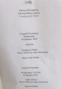 “Town of Fromberg * 118 west River Street * Fromberg Mt. 59029 * Council Workshop* Wednesday * 16 January 2019 * 7:00 PM * Employee Policy * There will be no other discussion * Open to the Public * Council Workshop * Wednesday  7:15 PM * 16 January 2019 * Table of Fees * There will be no other discussion * Open to Public”