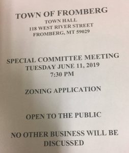 What is a “SPECIAL COMMITTEE MEETING? Who are the members of said “SPECIAL COMMITTEE”? What is the urgency of this “SPECIAL COMMITTEE MEETING”? Why can’t this simply be added to the Agenda for the next regularly scheduled Town Council Meeting? Has all due diligence been done with regard to this “ZONING APPLICATION”? Or is this another “rush to judgement” job like the Mackenzie Morass on First Street? The Town of Fromberg certainly can’t afford any more costly litigation. Why is there no consistency in any of the notices that come out of Town Hall? Will Mayor Miller deign to attend this “SPECIAL COMMITTEE MEETING” event? Why isn’t this notice posed on: http://www.fromberg-mt.com/Agenda?