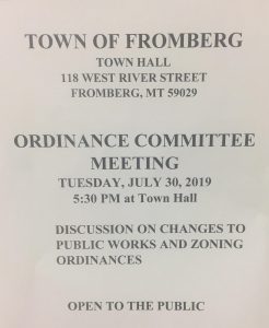 “TOWN OF FROMBERG, TOWN HALL, 118 WEST RIVER STREET, FROMBERG, MT 59029, ORDINANCE COMMITTEE MEETING, TUESDAY, JULY 30, 2019, 5:30 PM at Town Hall, DISCUSSION ON CHANGES TO PUBLIC WORKS AND ZONING ORDINANCES. OPEN TO THE PUBLIC”