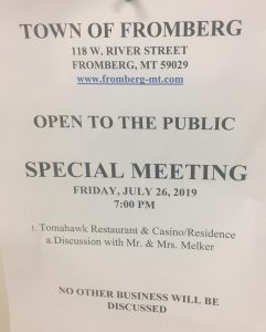“TOWN OF FROMBERG, 118 W. RIVER STREET, FROMBERG, MT 59029, www.fromberg-mt.com, OPEN TO THE PUBLIC, SPECIAL MEETING, FRIDAY, JULY 26. 2019.