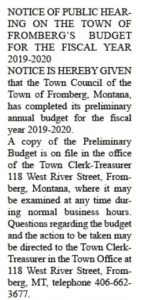 The following was published under “Legals” in the Carbon County News. Vol .99 N.34 on Thursday August 22, 2019. A simple phone call to the Carbon County News at 406.446.2222 could have easily remedied the situation by asking them to correct Fromberg Town Hall contact number to: 406.668.7383.