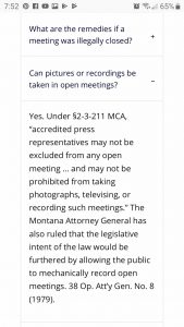 tfa offers the following with regard to: “8. New Business. c. Town policy regarding video of meetings” http://montanafoi.org/access-in-montana/open-meetings