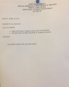 “DECIDE WHO TO HIRE FOR PUBLIC WORKS POSITION”? “SPECIAL EMERGENCY TOWN COUNCIL MEETING”?