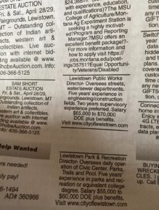Per the following screenshot, said TOF Public Works position was not advertised in the Carbon County News Classified Section last week. The Carbon County News is Fromberg, Montana’s paper of record.