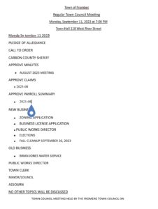 TOF 9.11.2023 REGULARLY SCHEDULED TOWN COUNCIL MEETING AGENDA – 7PMadminSeptember 8, 2023Uncategorized Expandable Google Docs link follows: https://drive.google.com/file/d/1V_aRX7WO1qIWwnVfHpVflbSh3k_GhTia/view?usp=drivesdk