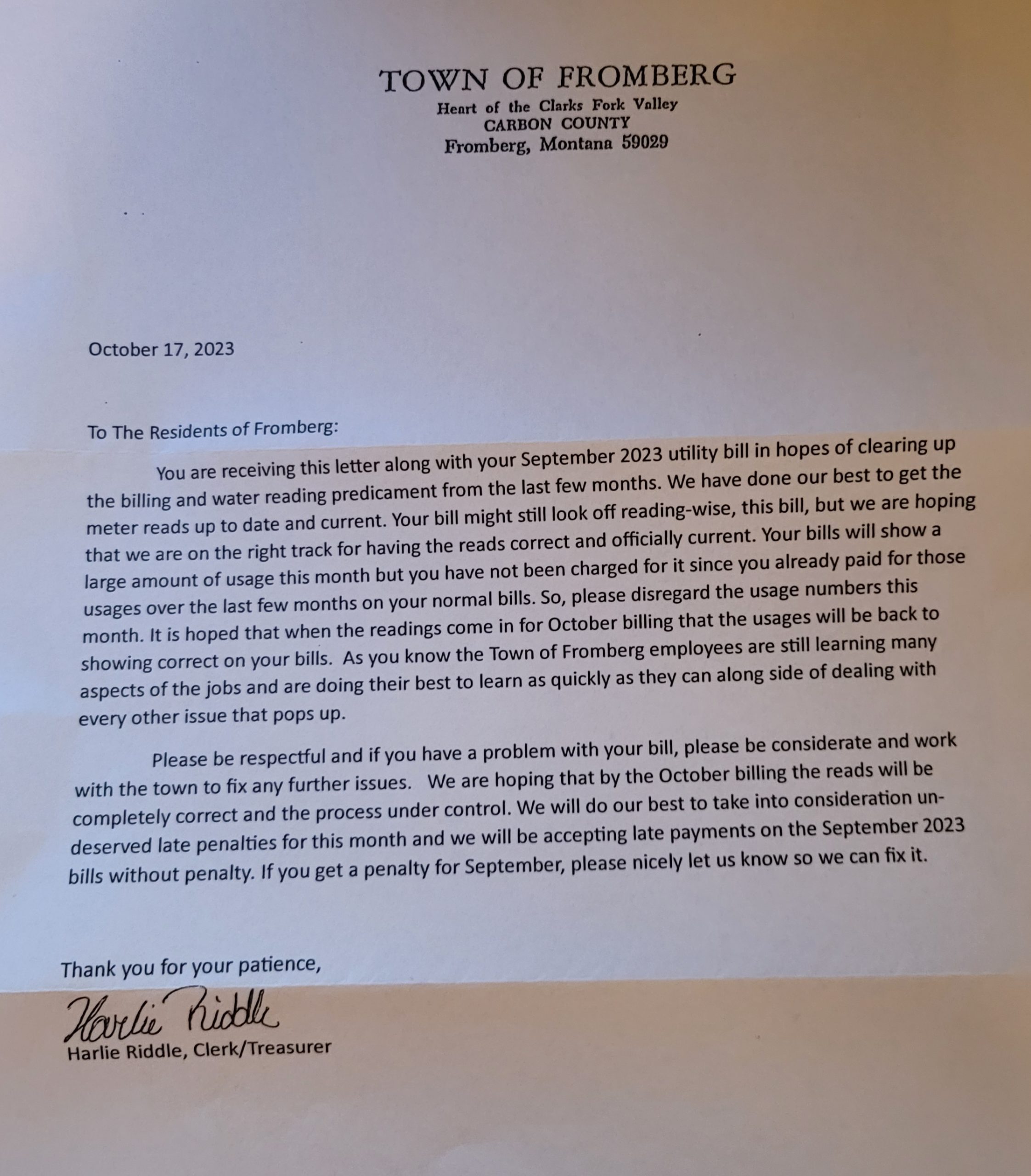 “Please be respectful and if you have a problem with your bill, please be considerate and work with the town to fix any further issues.”