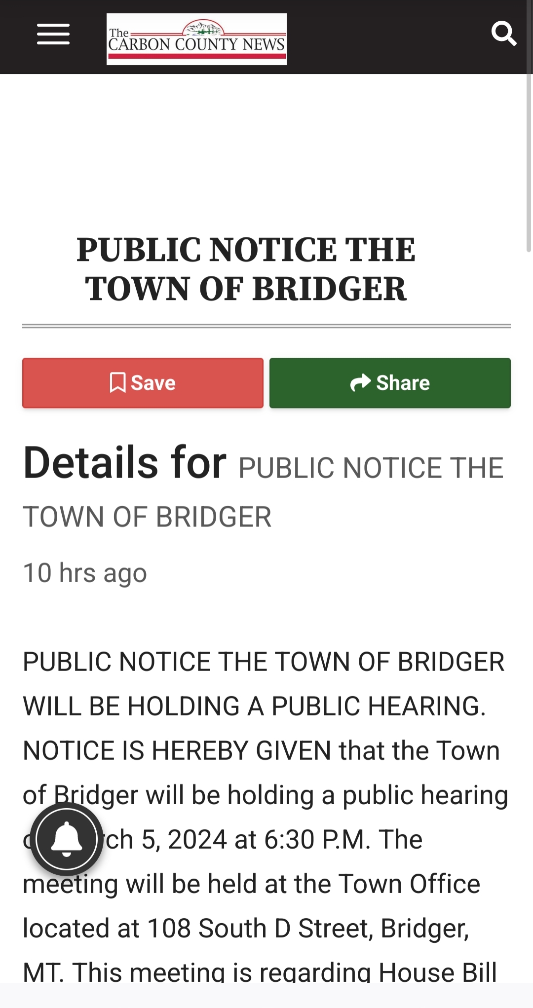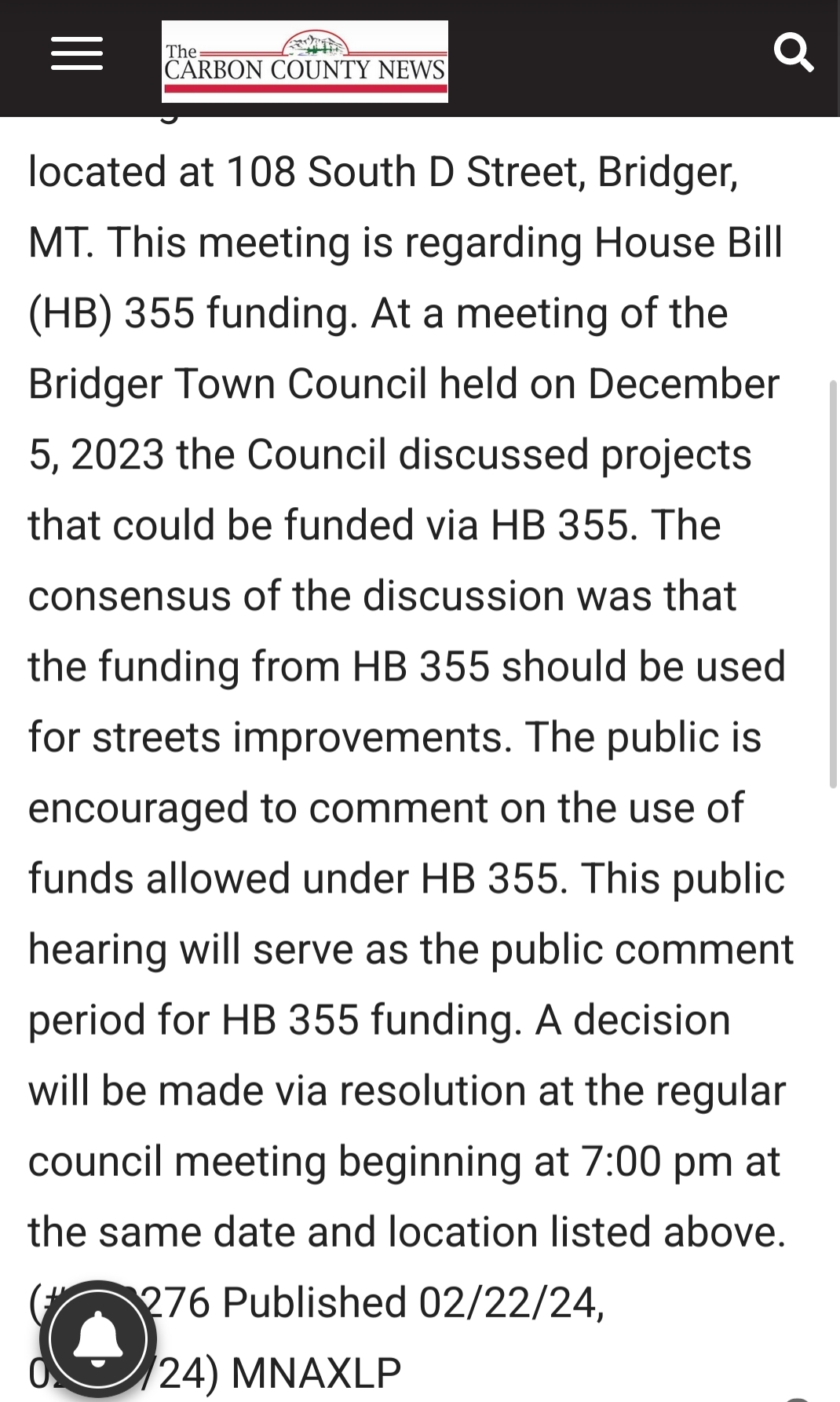 Whereas, the Town of Bridger, MT advertises twice for a Public Hearing in our local paper of record: The Carbon County News, as follows: