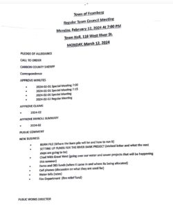 The date on the Agenda posted below is WRONG!  The correct date should be: Monday* March 11, 2024.  tfa notes that TOF communications littered with incorrect dates, grammatical errors, while additionally lacking clarity, and specificity, do not inspire confidence with Fromberg customers and constituents.