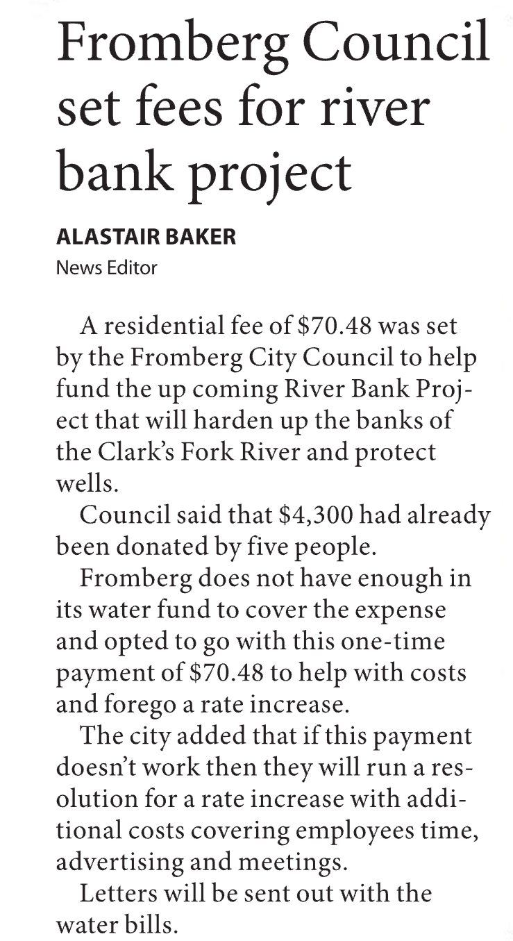 The foregoing new story is sourced from The Carbon County News. Vol. 104 No. 13 – Thursday March 28, 2024: https://www.carboncountynews.com/news/fromberg-council-set-fees-for-river-bank-project/article_1bb4e4c6-eba3-11ee-b412-bb3bcf129cfa.html