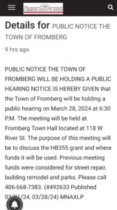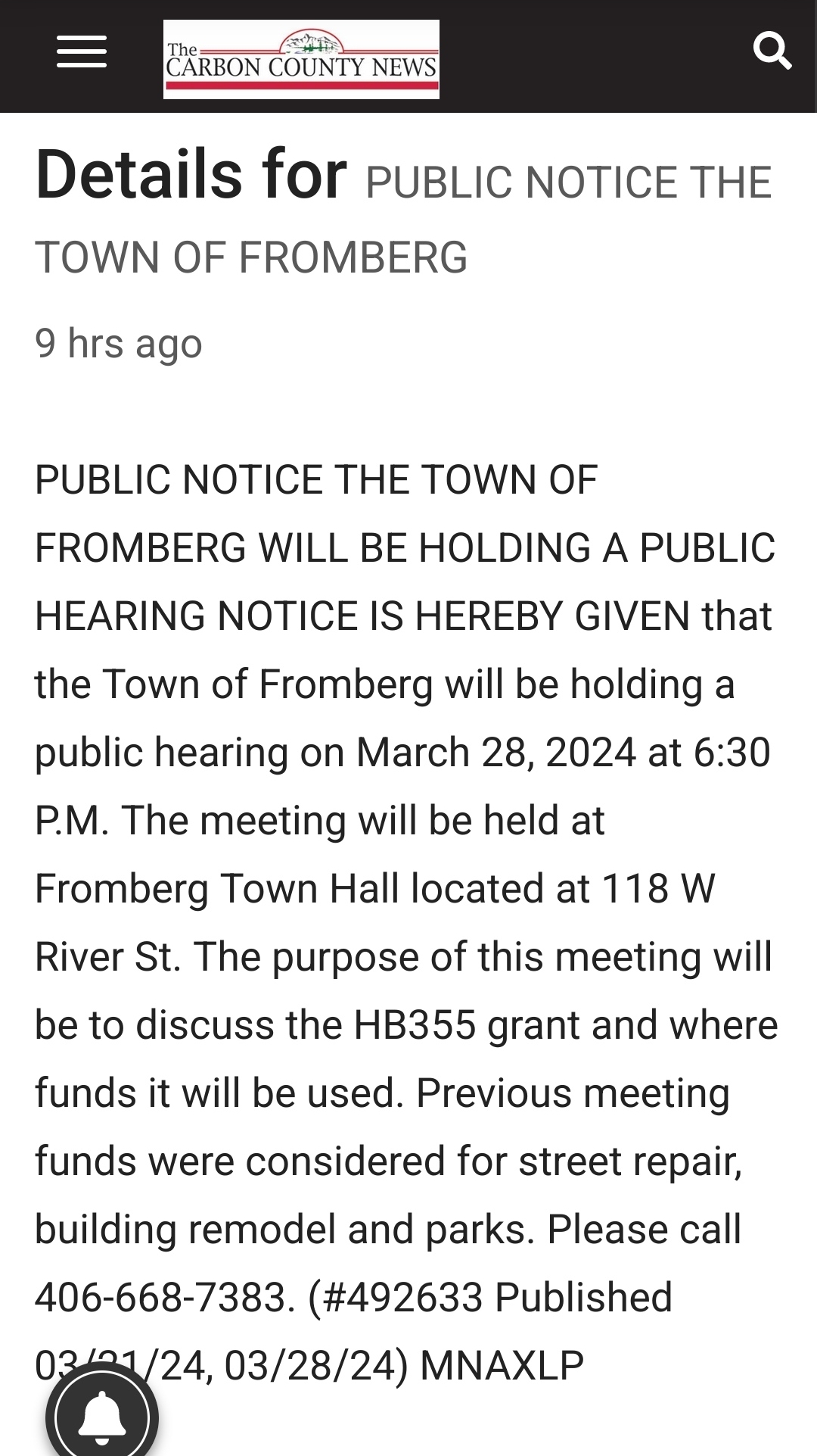TOF Public Hearing to be Held Tonight at 6:30PM?adminMarch 28, 2024Uncategorized tfa observes said notice has not been placed at any of TOF’s 3 designated posting areas? The foregoing Public Notice is sourced from The Carbon County News. Vol. 104 No. 13 – Thursday March 28, 2024.