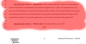 20 fund to the department of administration for the biennium beginning July 1, 2023. The appropriation must be used to provide $500 grants to the government agencies listed in [section 1(1)(f) through (1)(i)] for the purposes