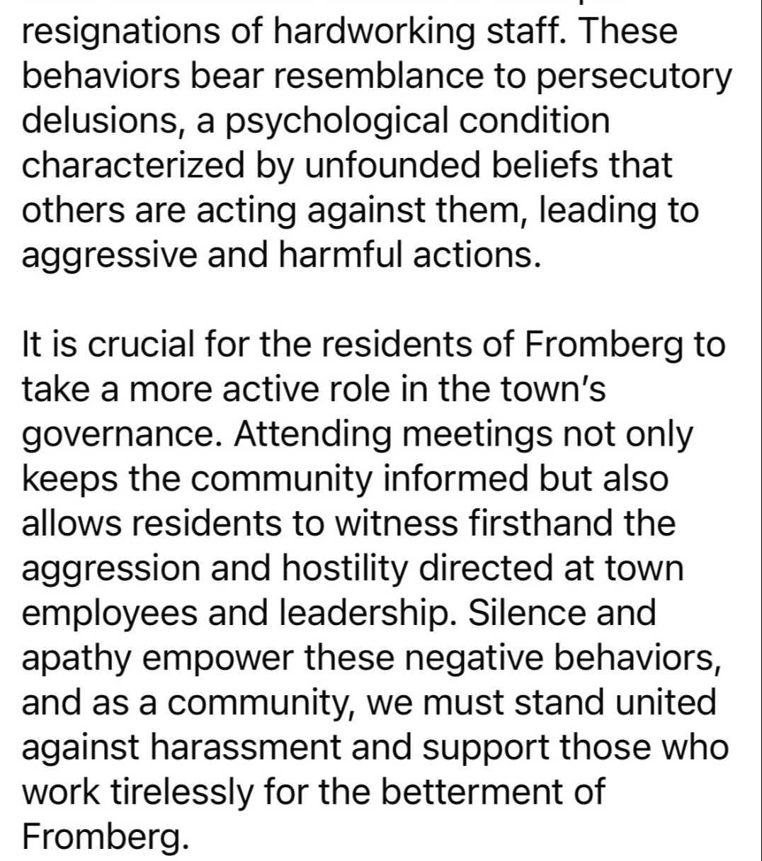 2. Are you kidding me. Just as usual pointing figures at others but not taking responsibility for own actions and what caused the divide in the town. Of course it’s everyone else’s fault but the man at the helm of things. Just like his resignation letter as mayor. Pointed out everyone else’s faults but will not hold himself accountable. And his children act like he is the king of Fromberg. Wrong he is the one that has damaged this town and the school. The mayor of the town and the superintendent of the school should work hand in hand on things to build a strong community especially in a small town like Fromberg. Instead he did damage to the school on multiple occasions. For example asking the school for FEMA $ back which is a federal crime. Thank god the chairperson of the school has a brain and knows the law well unlike Timmy! Also going to Q2 news about everything and making it about himself and pissing off a huge taxpayer/family members about a car accident he had no clue about but hey I can be the king of the news yet again. Kicking councilman Vently out of a meeting when ligament questions are being asked about DEQ violations and the chlorine in the water and why the public was not notified about the chlorine level. That could have killed someone or made them extremely sick and Timmy wouldn’t care. And instead of preaching to us about respect, collaboration, and active participation maybe you Timmy should look in the mirror as you lacked all of those things.